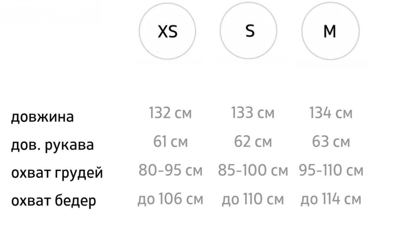 | Розмір | Груди | Талія | Стегна | Довжина плеча | Довжина рукава | Довжина пальто |